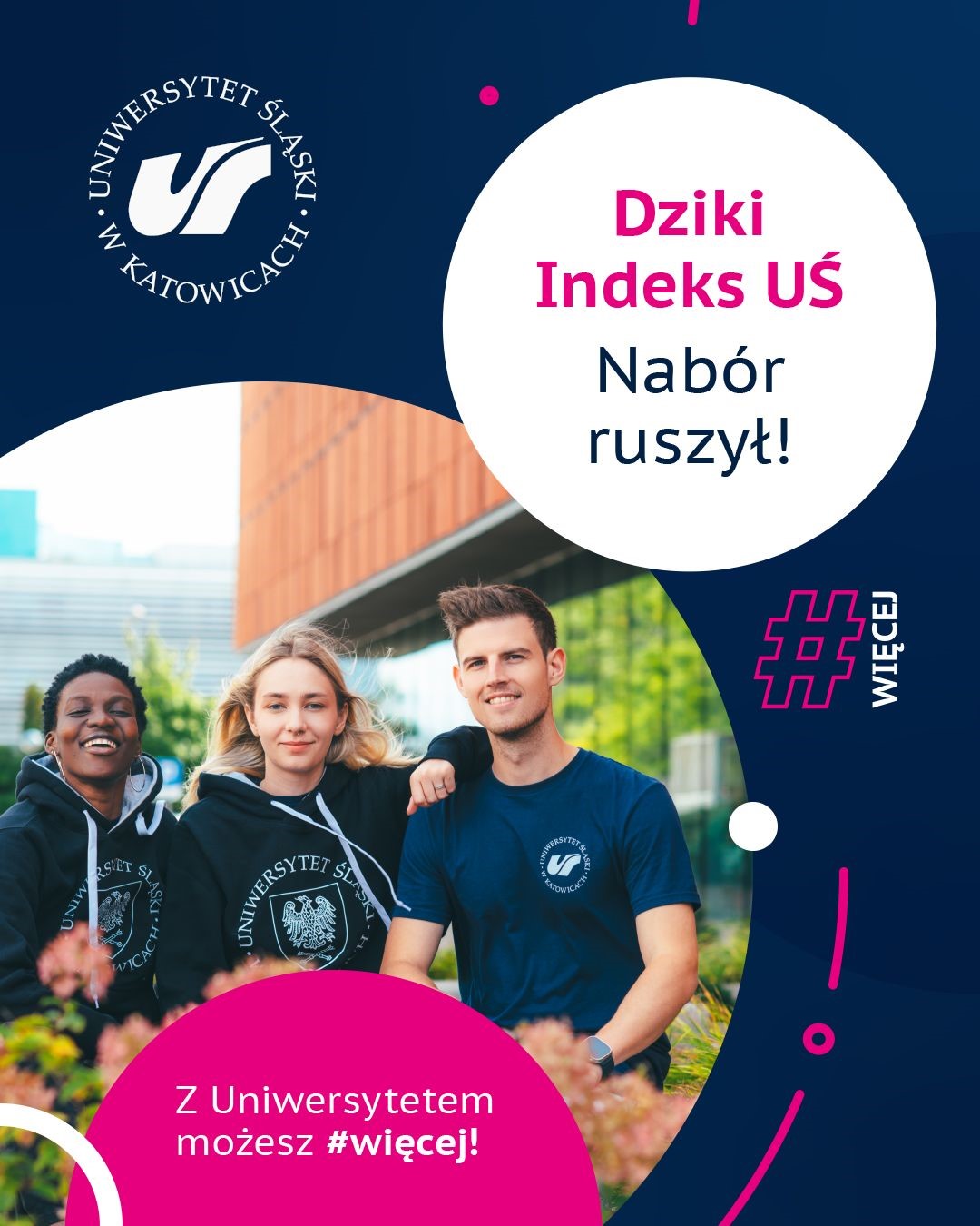 Dziki Indeks Uniwersytetu Śląskiego to konkurs skierowany do maturzystek i maturzystów zdających egzamin maturalny w 2026 roku oraz planujących rozpoczęcie studiów na Uniwersytecie Śląskim. Konkurs stanowi alternatywną ścieżkę rekrutacji i umożliwia przyjęcie na wybrane kierunki studiów z pominięciem standardowego postępowania kwalifikacyjnego.
