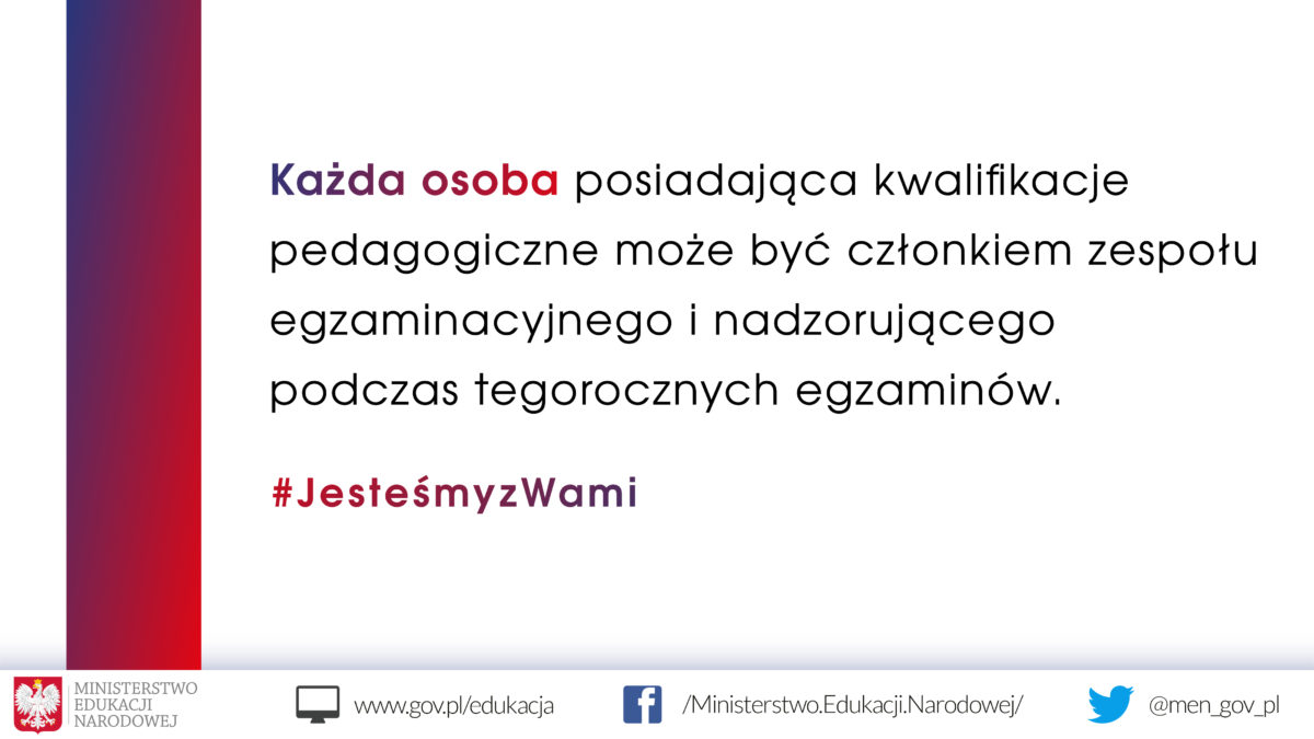 Rozmowy ze związkami zawodowymi w Centrum Dialogu trwają i wszyscy mamy nadzieję, że egzaminy zostaną przeprowadzone przez nauczycieli zatrudnionych w szkole. Gdyby wszakże zaistniała konieczność uzupełnienia składu zespołów nadzorujących, proszę…