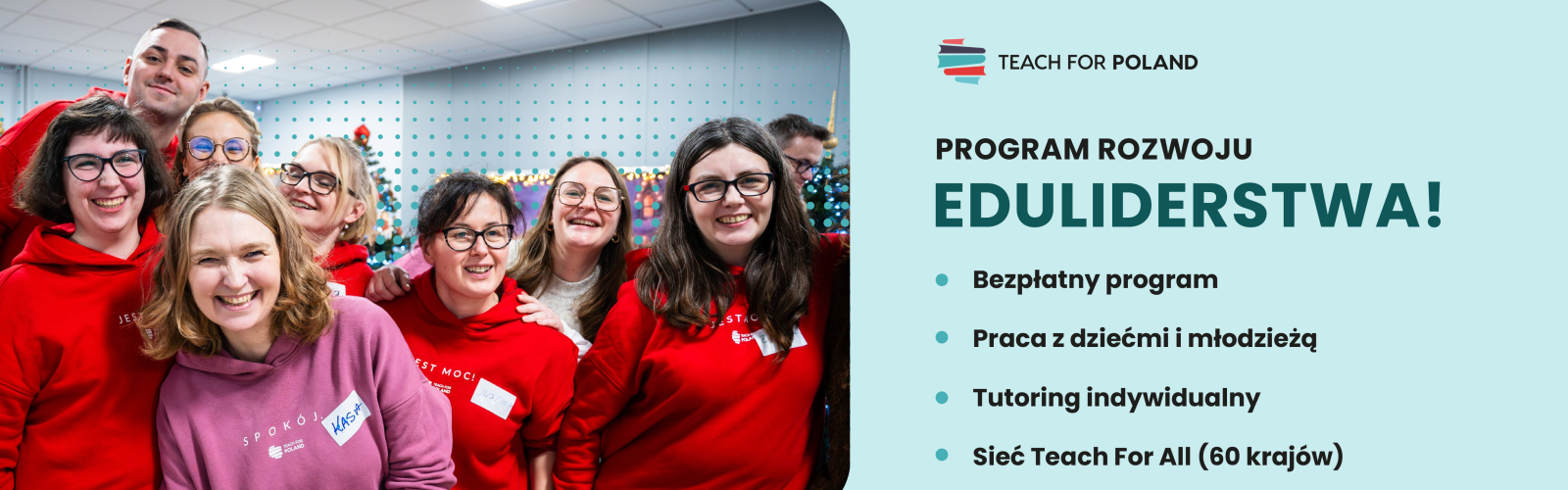 Informujemy, że ruszyła rekrutacja do 6. edycji Programu Rozwoju EduLiderstwa Teach for Poland – dwuletniego programu rozwojowego przygotowującego osoby pracujące w edukacji (lub wchodzące do niej) do roli liderów i liderek zmiany.